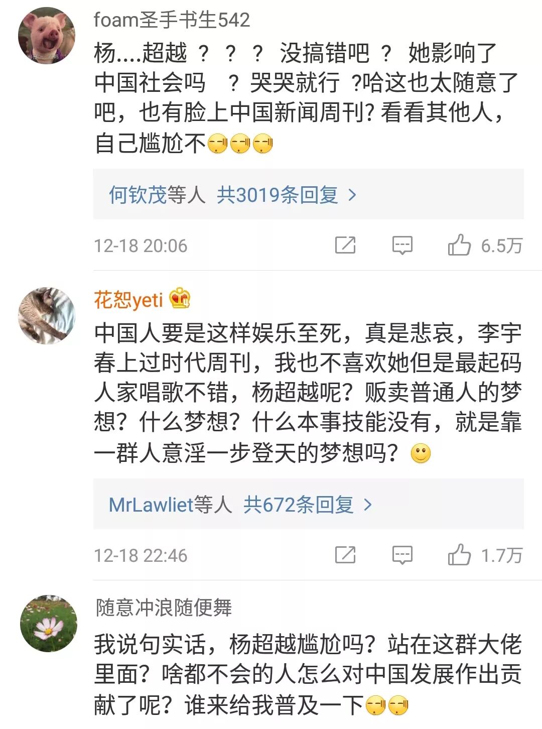 杨超越又一次登上了微博热搜,不是因为锦鲤,也不是因为划水,而是因为拿奖——影响中国年度人物。 新闻一出,舆论哗然: 就像众多网友惊讶的那样,杨超越怎么影响中国影响社会了? 在颁奖词中,主办方是这么说的:“这个年轻女孩身上折射出一个时代普通人的奇迹与梦想。” 什么是这个时代普通人的奇迹?是不用努力,长的好看就能影响中国吗? 而这样的事情,数不胜数: 今天范冰冰拿了国家精神造就奖,明天鹿晗破纪录了,后天吴亦凡在欧美榜单霸榜了…… 最悲哀的,还不是杨超越们获奖,而是只有杨超越获奖了,我们才知道原来有这么个奖。 这种现象不能怪杨超越。 1995年,美国著名战略问题专家布热津斯基提出了一个战略: 即在80%人的嘴中塞一个“奶嘴”,用娱乐、网络游戏、口水战、肥皂剧等方式,占用人们大量的时间,让其在不知不觉中丧失思考的能力。 这是西方国家对付中国的文化毒品,大力发展娱乐文化产业对青少年的影响,让更多的明星去登上杂志电视,让她们的绯闻去登上报纸,让科学家的事埋没在研究所。 所以现在这个时代,大家打网络游戏入迷,玩抖音沉溺,所有的社交网络上,大家喜闻乐见的,都是明星们的家长里短。 这段时间,改革开放40年,那么多伟大功绩有几个人关注了?但是一个杨超越获奖,就成了全民热点; 前段时间,诺贝尔颁奖,又有几个人讨论了?但是范冰冰的事情人尽皆知; 还有航天机构的研究员离职,引发了一阵子的讨论,可是迅速被张雨绮离婚又复合盖过去。 明星打个喷嚏上个厕所都能上热搜,而仅仅9月,我们去世了那么多的院士,连个蜡烛都没攒够: 包括这次杨超越获得的年度人物奖,除了杨超越,剩下的人又有几个人认识? 恰恰,他们都是切切实实的中国之脊梁,国人之骄傲: 刘国梁:中国第一位男子乒坛大满贯,为国家拿下无数冠军和奖项; 王贻芳:中国首位获得基础物理学突破奖的科学家,长期从事高能物理实验研究; 文牧野:《我不是药神》导演,以一部电影唤起整个社会的反思; 沈德咏:今年刚刚卸任一级大法官; 单霁翔是故宫博物院院长; 陶斯亮是中国市长协会专职副会长; 龚克是研究卫星通讯的的科学家; 朱民曾经是IMF副总裁; 黄永玉是央美教授; 陈光中是政法大学终身教授; ...... 他们用了一辈子在各个领域做出成绩和贡献,却必须捆绑一个流量明星,才能被人知道。 美国学者尼尔·波兹曼在他的著作《娱乐至死》中写道: “一切公众话语日渐以娱乐的方式出现,并成为一种文化精神。我们的政治、宗教、新闻、体育、教育和商业都心甘情愿地成为娱乐的附庸,毫无怨言,甚至无声无息,其结果是我们成了一个娱乐至死的物种。” 而这句话,就在我们这一代、就在今天,应验了。 “将军孤坟无人问,戏子家事天下知。” 真真国之悲哀,时代的悲哀,更是我们每个人的悲哀。 所以今天,我一定得给大家介绍这样一群人,他们才是真正给我们这个时代、社会、国家带来正能量,和做出了伟大贡献的人。 也许他们并不在乎名利的身外物,但是我们在享受他们用一生研究出来的科技成果时,我们就应该在心里给他们鞠躬。 2009年12月,黄大年毅然放弃了在英国优厚的待遇,怀着一腔爱国热情回到祖国,重点攻关国家急需的“地球深部探测仪器”。 外媒这么报道黄大年回国:黄大年让某国当年的航母演习舰队后退了100海里。 他和家人聚少离多,在朋友圈感慨:可怜老妻孤守在家,在挂念中麻木,在空守中老去。 最后患胆管癌去世了,年仅58岁。 他在吉林大学的工作自述中,写道:回想当初的选择,我没后悔过。祖国高于一切。 看到这张发黄的纸,我泪奔了。 我国爆炸力学与核试验工程领域著名专家、中国工程院院士林俊德,坚守在罗布泊52年,参加核试验45次。 在生命的最后,得了癌症。义无反顾地搬出了重症监护室,保存好涉密文件。 他说:如果没交代好这些,我没办法放心地走。 处于半晕厥状态的他,连呼吸都困难,却在一遍遍地问:“文件存好了吗?” 这才是大爱,才是真英雄! 改革开放四十年,还有一群巾帼们,让我们的国家更美好,她们比杨超越们,更配得上“影响中国”人物奖。 清华大学和普林斯顿的学术女神颜宁,30岁成为清华最年轻的博导,37岁率领平均年龄不到30岁的团队,用6个月的时间攻克困扰生物学界半世纪的科学难题。